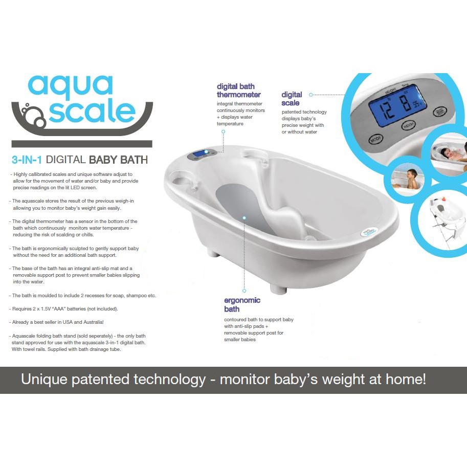 On90e Dwfe2pvm from assets.babybunting.com.au Weight your baby at bath time with the revolutionary aquascale. I found the perfect baby tub! It helps you monitor the temperature of the bath water, while letting you know about the weight of the baby. It records your baby's precise weight, while making adjustments for water and movement. Ergonomic shape to hold babies in the correct position. Aqua scale, the first multifaceted baby bath tub of its kind, allows parents to know the precise weight of their baby while constantly monitoring the temperature of the water all during bath time. Lay the baby in the aquascale™ and press net to get the baby's net weight. The aqua scale 3 in 1 is a digital scale, water thermometer & infant tub all in one.